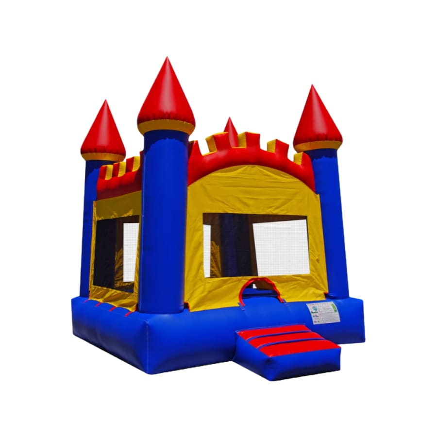 This bounce house is sure to be a crowd pleaser. The 15x15 Arched Castle is a great option to your party. The Arched Castle is designed in a yellow, red, and blue color. This product is made of top-quality industry vinyl. A classic look that will provide so much fun for everyone. Bounce, hop and skip in this fun Arched Castle Bouncy on rent.