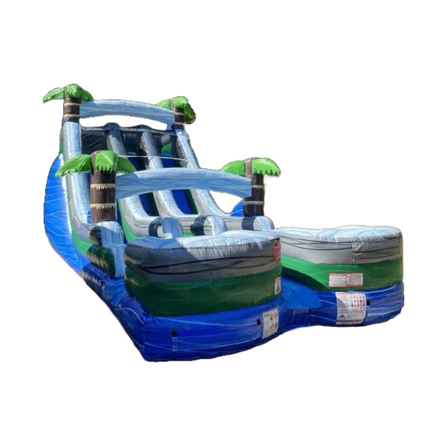 Make a splash at your beach-themed party with our 18' Tropical Dual Slide! 🌴 This double lane water slide is the ultimate attraction to bring the excitement of the coast to your event. Kids and adults alike can ride the waves of fun as they slide down this tropical-inspired masterpiece.