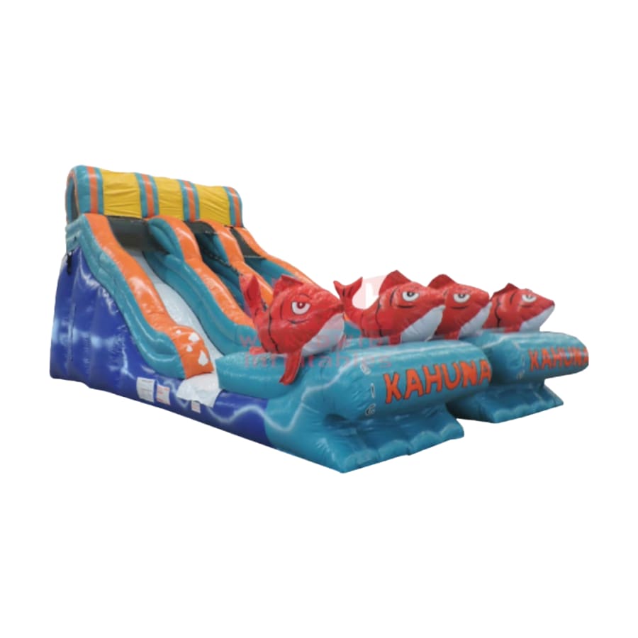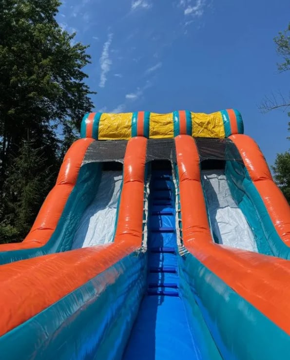 Make a splash at your upcoming summer bash with the 20' Big Kahuna Slide rental! This exhilarating double-lane water slide stands at an impressive 20 feet high, offering thrill-seekers of all ages a thrilling ride down to the refreshing splash pool below.
